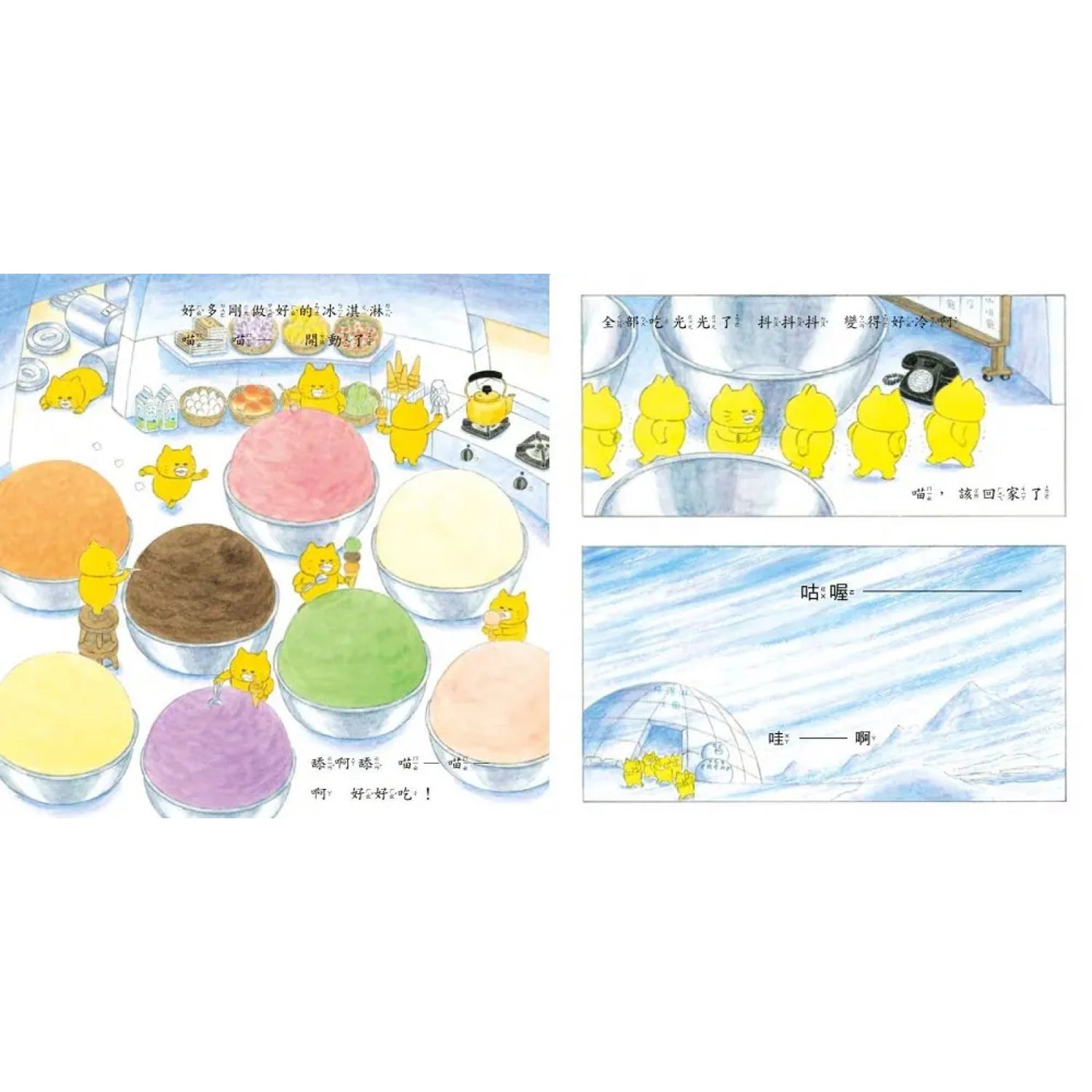 牠們偷偷躲進空空的冰桶裡,來到冰淇淋工廠,把整個工廠的冰淇淋吃光光,離開時風雪交加,冷得野貓們變成了野貓雪糕。